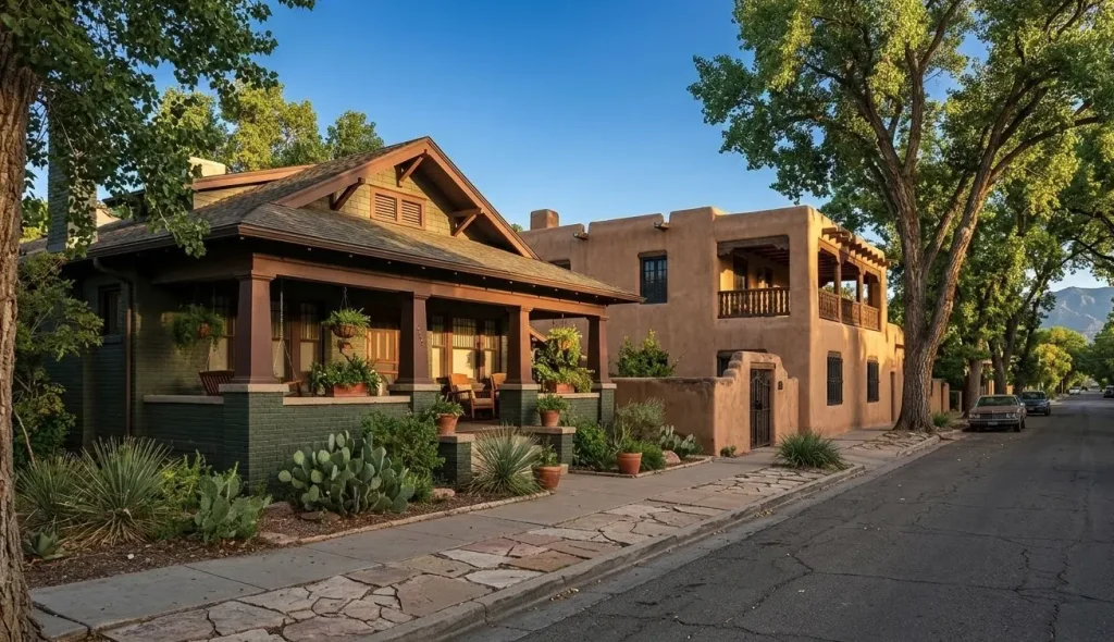 Few Albuquerque neighborhoods can claim the architectural diversity found in Huning Castle. Spanish-Pueblo Revival adobes sit comfortably alongside Craftsman bungalows and early 20th-century historic homes, creating a streetscape that feels like a living museum of New Mexico residential design. The neighborhood’s transitional position — anchored by the Route 66 corridor of Central Avenue — gives it a rare dual identity: historically rooted yet close to modern amenities. This character draws artists, academics, and longtime Albuquerque families who value authenticity over newness.