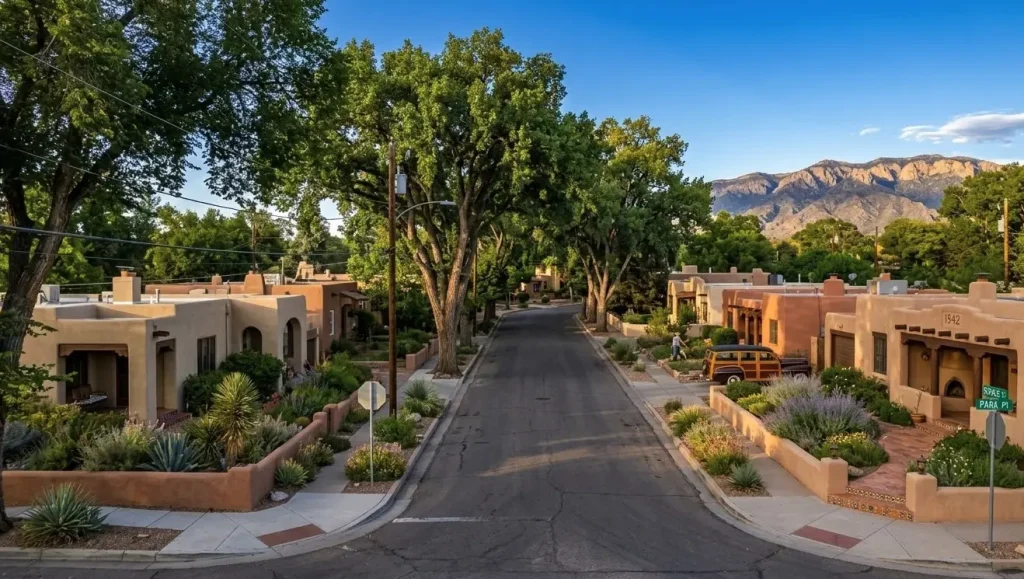 What sets Spruce Park apart is the architectural cohesion of its streetscapes. Spanish-Pueblo Revival and historic adobe homes give the neighborhood a distinctly New Mexican identity that newer subdivisions simply cannot replicate. Thick earth-toned walls, carved wooden vigas, and arched entryways line block after block, creating an environment that feels rooted in the region’s cultural heritage. The mature elm and cottonwood canopy overhead adds a lushness rare in the high desert, making summer walks genuinely pleasant. This combination of architectural authenticity and verdant landscaping is what draws buyers and renters back to Spruce Park year after year.